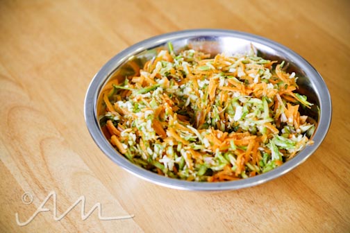 mix carrots, asparagus, and cabbage on “shred”. fluff together with a fork until “slaw-like” {don’t you just love my technical terms?!} in the meantime, remove gills from your mushrooms and set on a baking sheet.