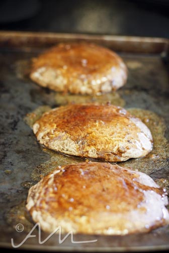 once oven is heated, give the portobellos a little bath in the shitake sesame dressing and pop them in.