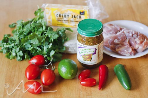 if you have a food processor, i recommend throwing in your peppers, cilantro, tomatoes, and squeeze of lime and blending that into a sauce-like consistency.  then, take your tortilla and pile in your chicken, mix in the pepper/tomato sauce blend, sprinkle in some cheese, and wrap.