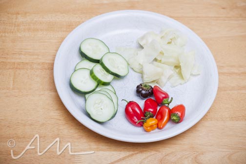 raw cucumbers, mini sweet peppers, leftover green cabbage…
