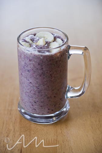 smoothie with raw protein powder, OJ, mixed berries, bananas, spinach, and chia seeds.
