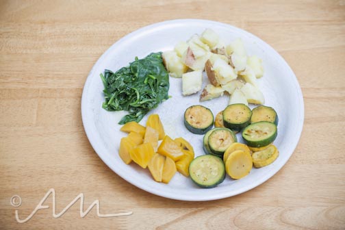 boiled red potatoes, steam-sauteed zucchini and squash, golden beets, steamed spinach.  i was totally craving the spinach and the potatoes.