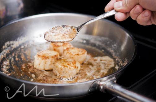 heat butter on a low setting.  sprinkle scallops with a little S&P, then place in pan, cooking them on low to medium heat for about 7-8 minutes on one side.  shift the pan around so they do not stick… you’ll want the sides to brown a little, creating all those yummy juices.  flip them only once, like a good steak.  as they finish cooking on the second side, tilt your pan a little to gather and pour the drippings over the scallops, like so :